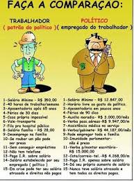 ganhar R$ 18.000.00. Os valores aprovados são válidos de 2013 a 2016, comforme a mídia. O CUSTO DE CADA TRABALHADOR que recebe o SALÁRIO MÍNIMO para os COFRES PÚBLICOS é algo em torno de R$ 8.136,00, e de R$ 216.000,00 para cada vereador..Cálculos referente a um período de doze meses. Tal disparidade não se apresenta bem mais aguda, graças a política do GANHO REAL, adotada para o SALÁRIO MÍNIMO pelo GOVERNO FEDERAL DO PT,nos últimos dez anos. Mesmo assim,a disparidade salarial entre POLÍTICOS e ASSALARIADOS DO MÍNIMO ainda é ABSURDA e IMORAL.Qual seria o encaminhamento indicado para se resolver tal IMORALIDADE? Talvez, esperar quando DEUS quiser ou pela vontade da grande massa trabalhadora.Portanto, se a indecisão permanece, os VEREADORES já decidiram: Em 2013, irão CHORAR DE ALEGRIA e os assalariados do mínimo SORRIR PARA NÃO CHORAR. Afinal, o Brasil colônia ainda não morreu. UNI-VOS!Categoria: Boca no trombone